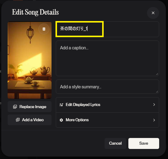 各曲の右側にある3点マークをクリックSong Detaileをクリックしタイトル変更しSaveを