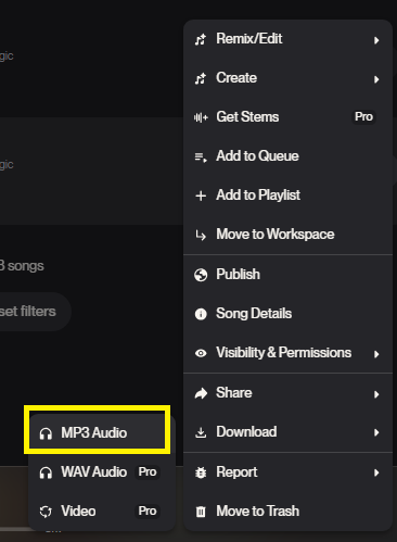 各曲の右側にある3点マークをクリックしDownload-MP3 Audioにてダウンロードします