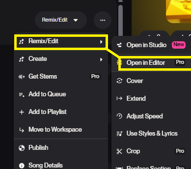 修正したい曲の右の3点ボタンをクリックしRemix/Edit→Open in Editorをクリックします