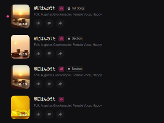 約20秒で、同じタイトルの曲が2曲生成 されます。
