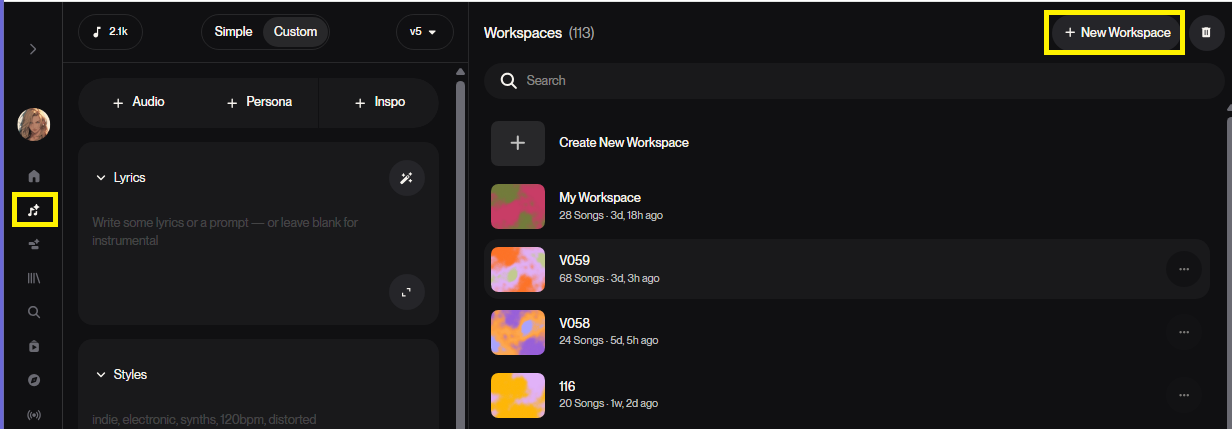 SUNO AIの左メニューで Create → New Workspace を選択します。