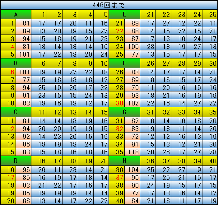 📊 全ゾーン(A〜H)出現データ一覧(446回分)