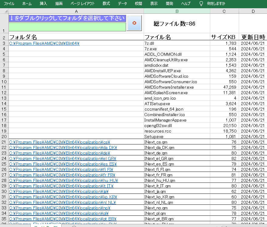 Excelだけでフォルダ内のファイル一覧を一括取得できるツール です。