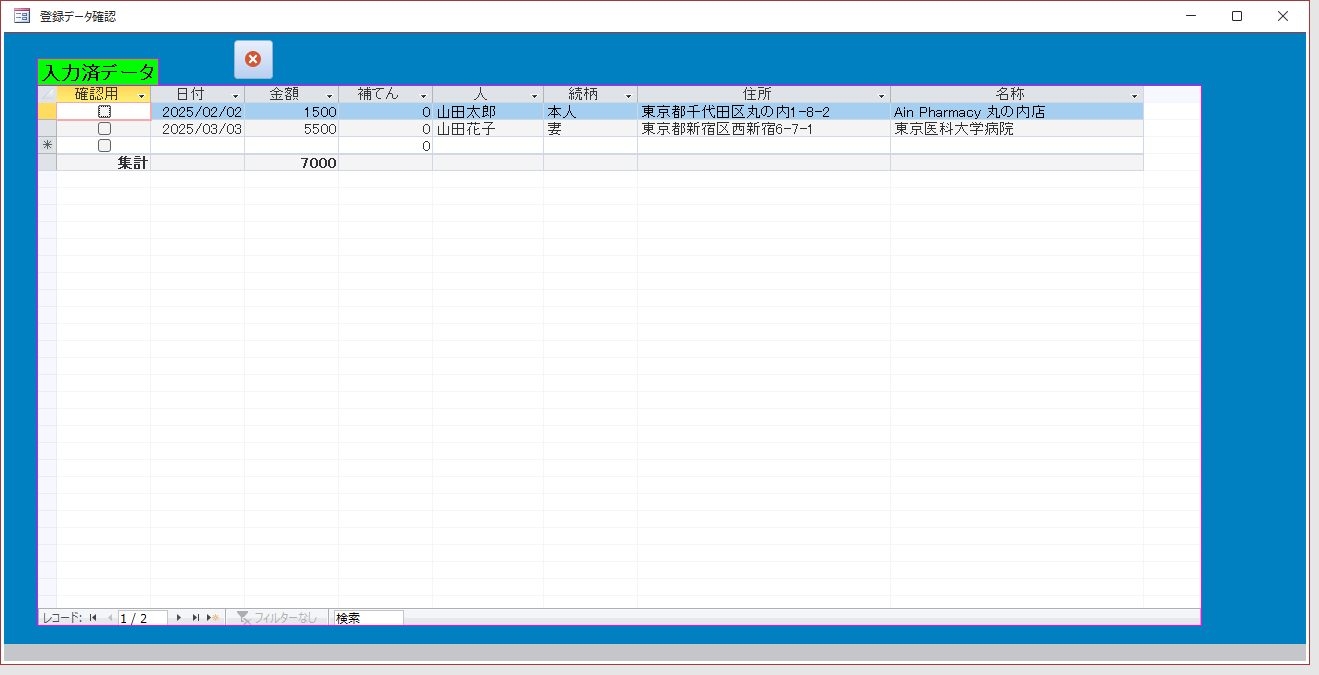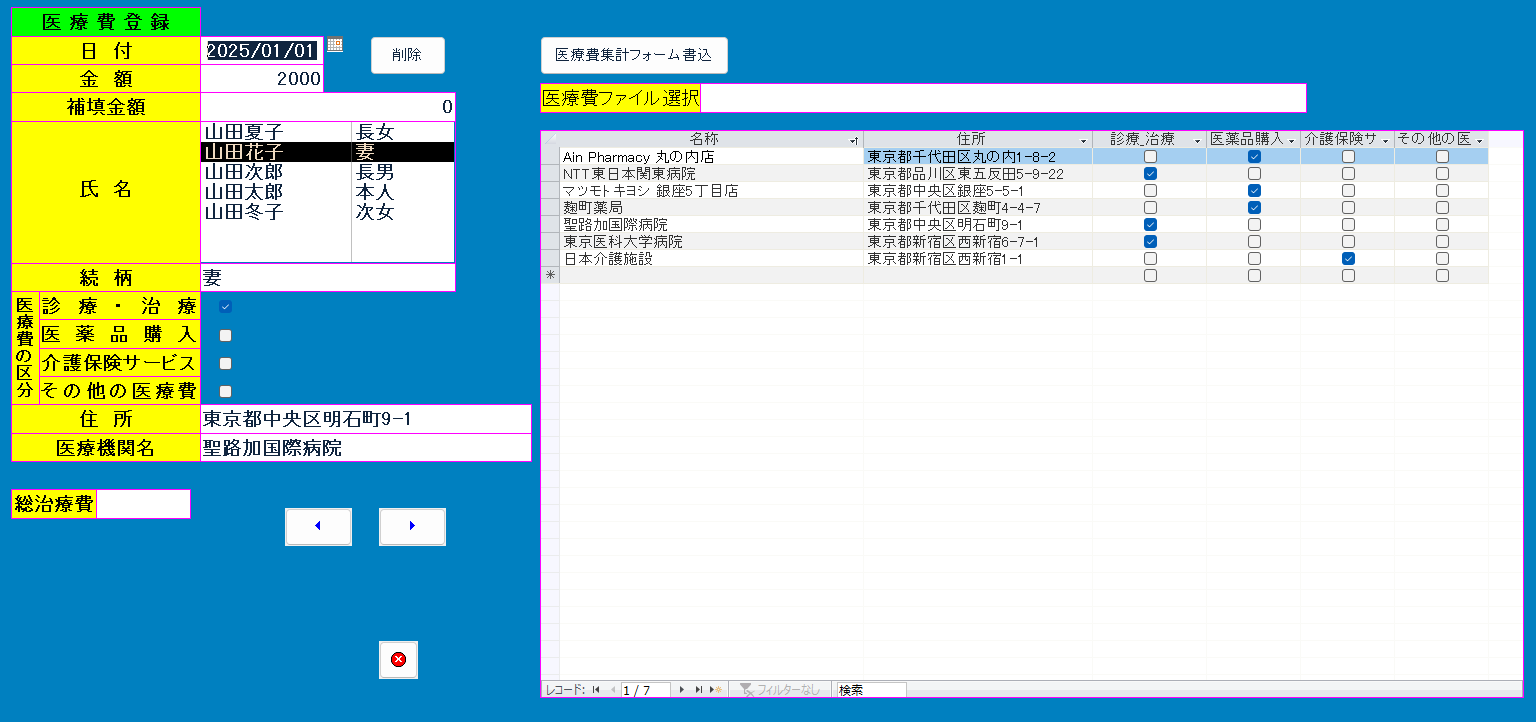 • 医療費データ(氏名・続柄・医療機関・金額など)を Access で登録